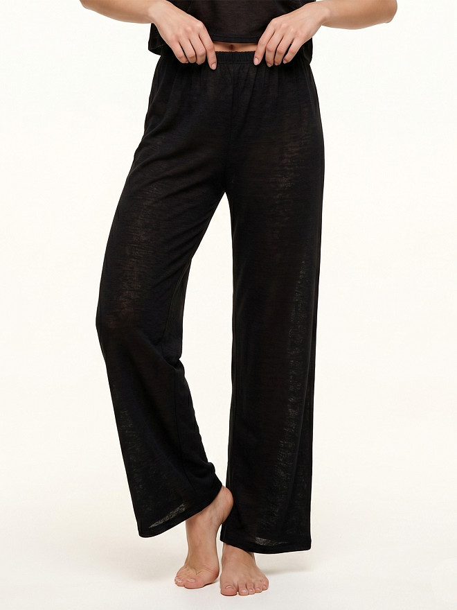 Брюки выполнены из тонкой и мягкой вискозы в сочетании с полиэстром. Крой свободный. Стандартная посадка. Материал хорошо пропускает воздух и позволяют коже дышать. Не вызывает раздражений при соприкосновении с кожей. Прекрасно подходят для носки дома в качестве домашней одежды или для пляжного отдыха за счет легкой прозрачности ткани.