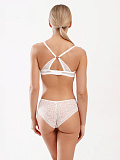 Бюстгальтер пуш-ап на стане с косточками выполнен из деликатного кружева "суфле" c цветочным принтом. Данная модель отлично поддерживает, собирает и визуально увеличивает грудь, а также обеспечивает прекрасную посадку. Две тонкие бретели пересекаются на спинке, создавая выразительный и женственный акцент. Перекрестие зафиксировано небольшой декоративной деталью, что добавляет изысканности. Благодаря данной особенности бюстгальтер можно надевать под майки с открытой проймой. Застегивается бюстгальтер сзади на крючки-петли. Данная модель идеально подходит для обладательниц малых форм.
