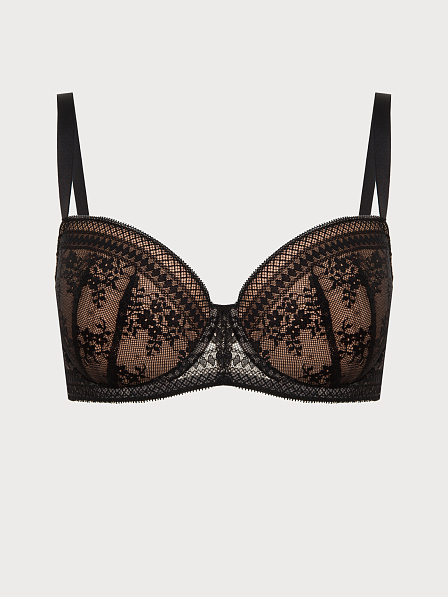 Бюстгальтер с легким уплотнением чашек на стане из деликатного кружева c цветочно-геометричным рисунком. Данная модель на косточках обеспечивает прекрасную поддержку груди и разработана специально с учетом особенностей обладательниц пышных форм. Бретели регулируются на спинке, не отстегиваются. Бюстгальтер застегивается сзади на крючки-петли.
