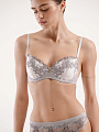 Бюстгальтер t-shirt на стане выполнен из деликатной вышивки на сетке. Стан изделия из микрофибры с деликатным блеском и шелковистостью. Передняя деталь декорирована бантиком с подвеской. Бретели регулируются на спинке, не отстегиваются. Бюстгальтер застегивается сзади на крючки-петли. Данный бюстгальтер специально с учетом особенностей обладательниц пышных форм.