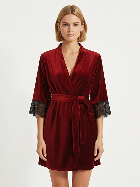 Халат кимоно средней длины с рукавами 3/4. Модель из нежного велюра в сочетании с эластичным кружевом. Пояс не притачной без внутренних завязок. Крой свободный.