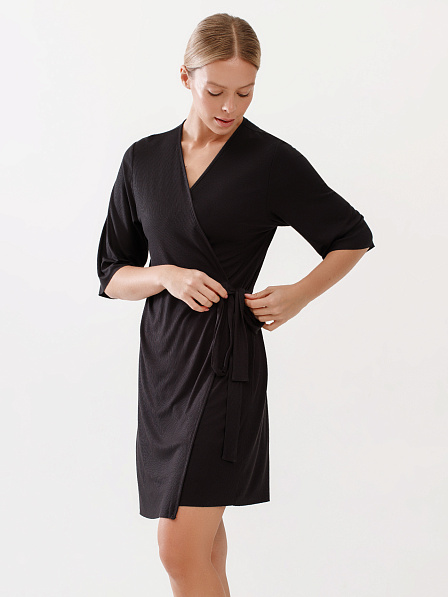 Халат с рукавом 3/4. Модель из мягкой вискозы в рубчик с обновленным поясом, который не распахивается при носке за счет функциональной конструкции. Крой свободный. Вискоза - материал, который хорошо пропускает воздух и позволяет коже дышать, ткань довольно невесома за счет невероятной легкости волокна.