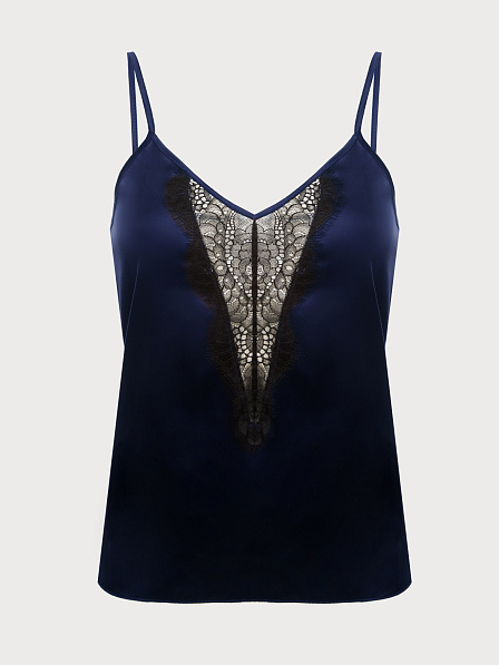 Майка с V-образным вырезом горловины из струящегося сатина в сочетании с эластичным кружевом. Узкие регулируемые бретели. Спинка имеет U-образный вырез и кружевную вставку V-образной формы. Стандартный крой имеет слегка приталенный силуэт.