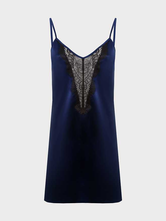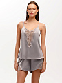 Майка с V-образным вырезом горловины из струящегося сатина в сочетании с эластичным кружевом. Узкие регулируемые бретели. Спинка имеет U-образный вырез и кружевную вставку V-образной формы. Стандартный крой имеет слегка приталенный силуэт.