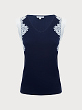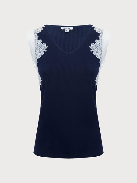 Майка из мягкой вискозы в рубчик. V-образный вырез горловины с инкрустацией кружевом по пройме. Инкрустация технически более сложно исполнима и используется в премиальных брендах и изделиях. Стандартный крой.