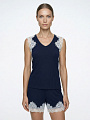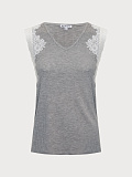 Майка из мягкой вискозы в рубчик. V-образный вырез горловины с инкрустацией кружевом по пройме. Инкрустация технически более сложно исполнима и используется в премиальных брендах и изделиях. Стандартный крой.