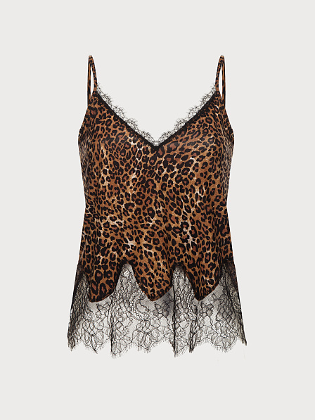 Мягкая вискоза, которая приятно ощущается на теле, не сковывает движения и позволяет коже «дышать». Идеальна для жаркой погоды! Эффектный леопардовый принт — классика, которая никогда не выходит из моды. Добавляет образу сексуальности и загадочности. Изящные кружевные вставки по вырезу и нижнему краю создают контраст с дерзким принтом, придавая топу утончённость и женственность.