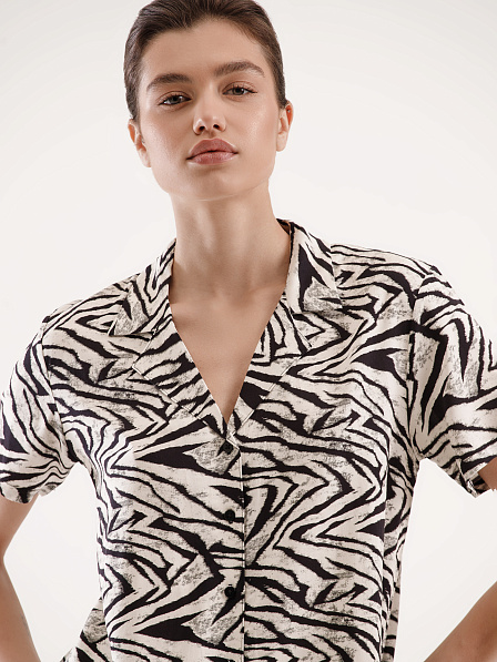 Рубашка с короткими рукавами, воротником и пуговичной застежкой по центру. Коллекция из 100% тканной вискозы с интересным принтом. Свободные силуэты и комфортный крой не сковывают движения. Тканная вискоза хорошо пропускает воздух и почти не ощущается на теле. Комфортная пижама для сна и отдыха.