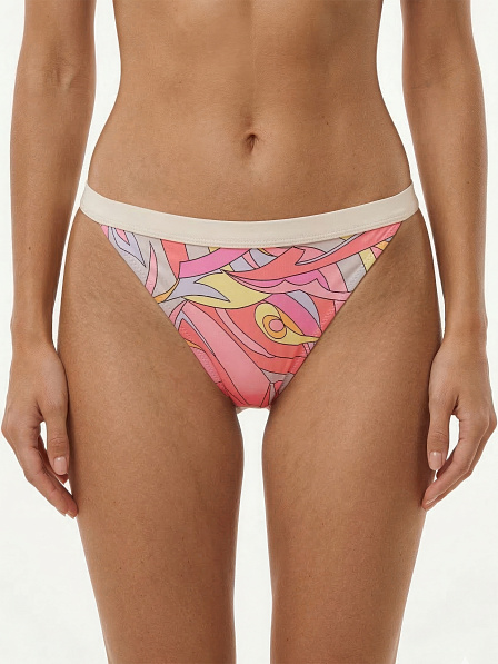 Плавки бикини c абстрактным принтом, декорированный контрастными кантами. Модель выполнена из мягкой и гладкой микрофибры. Посадка средняя.