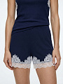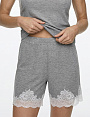 Шорты из мягкой и приятной к телу вискозы в рубчик. Низ изделия с инкрустацией кружевом. Свободный силуэт и комфортный крой не сковывают движения. Стандартная посадка. Эластичный пояс-резинка без завязок. Карманы в данной модели отсутствуют.