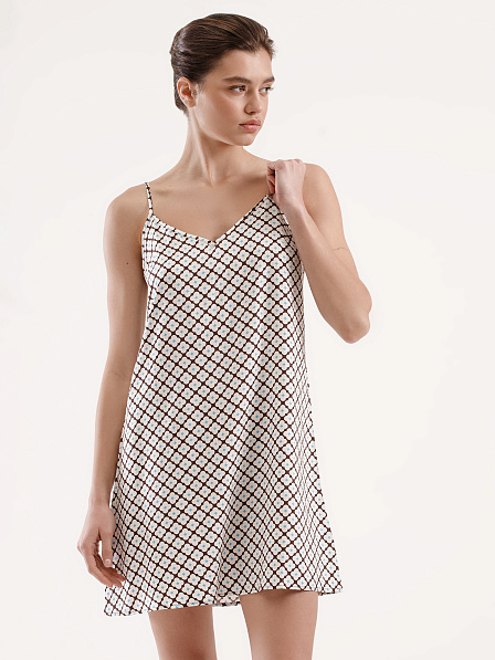 Сорочка из тканой вискозы. V-образный вырез горловины. Узкие регулируемые бретели. Стандартный крой. Коллекция из 100% тканной вискозы с интересным принтом. Свободные силуэты и комфортный крой не сковывают движения. Тканная вискоза хорошо пропускает воздух и почти не ощущается на теле.