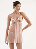 Сорочка беби-долл с чашками без косточек, без уплотнения. Выполнена из деликатной цветочной вышивки на сетке в сочетании с эластичной сеткой, декорирована тонкими стропами на передней части изделия. Регулируемые бретели на спинке.