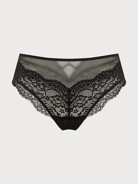 Трусы хипстер средней посадки, выполнены из деликатного кружева в сочетании с эластичной сеткой, декорированы стропами и фурнитурой серебристого цвета. Средний вырез бедра. Шов сзади обеспечивает оптимальную посадку.