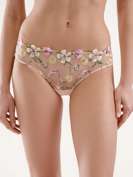Трусы слип классической средней посадки выполнены из деликатной цветочной вышивки на сетке. Шов сзади обеспечивает оптимальную посадку, в сочетании с декоративным элементом из вышивки. Средний вырез бедра. Подходят для любого типа фигуры. Ластовица из хлопка.