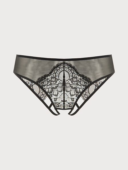 Уверты - откровенная модель трусов, название которых происходит от французского слова ouvert («открытый). Благодаря открытым ягодицам уверты являются самой провокационной моделью в коллекциях сексуального белья. Выполнены из деликатного кружева в сочетании с эластичной сеткой, посадка средняя, ластовица из хлопка отсутствует. Задняя часть трусов декорирована стропами и акссесуаром серебристого цвета. Привнесут в образ нотки пикантности и добавят отношениям  остроты.