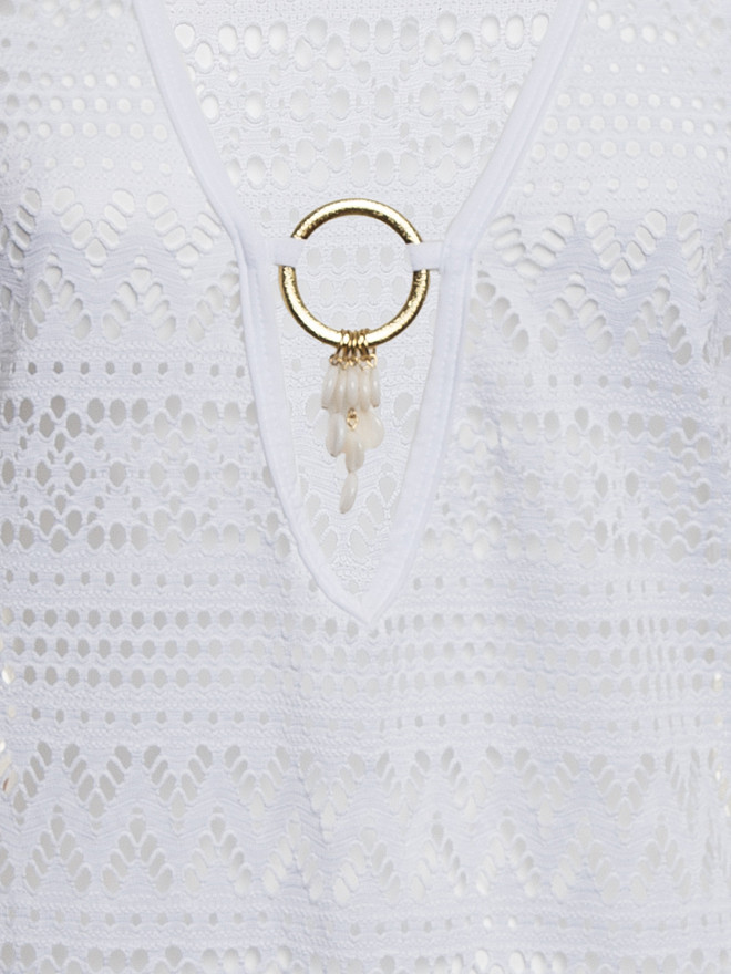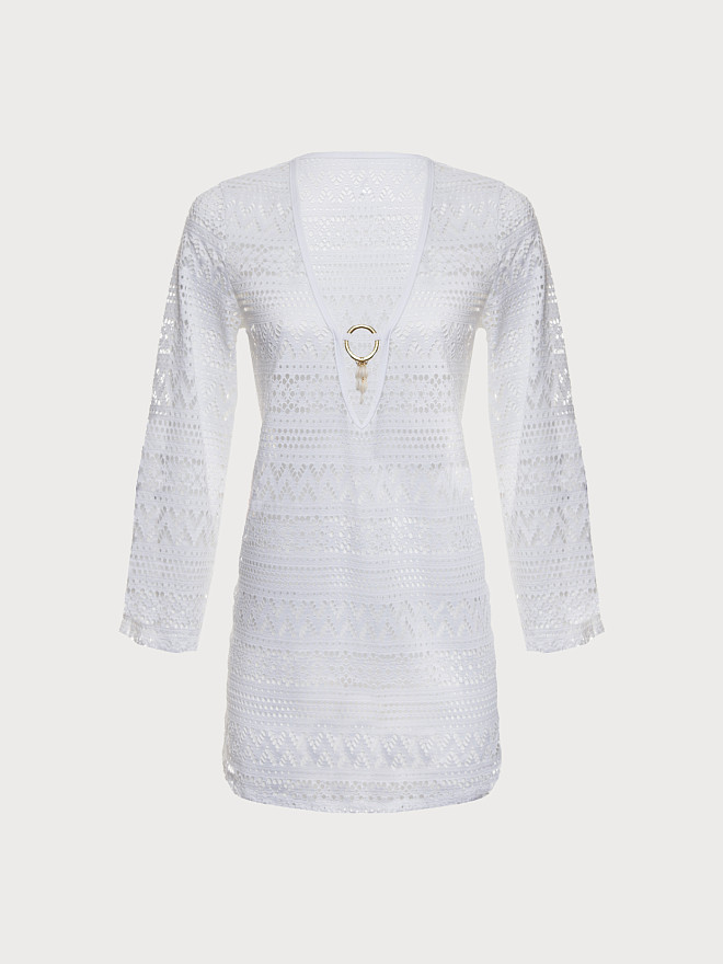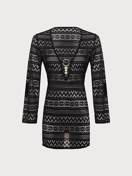 "Пляжная туника из кружевного полотна с геометрическим принтом — стиль и комфорт в одном изделии! Стильный дизайн. Геометрический принт придаёт модели современный и изысканный вид — такая туника станет изюминкой вашего пляжного гардероба.
